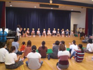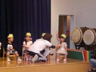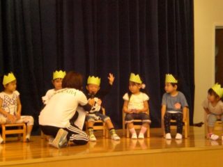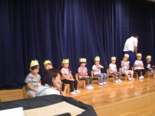 最後に、4~9月生まれのお友だちのお誕生日会をしました。ステージに上がってかんむりやプレゼントをもらい、みんなにお祝いしてもらってうれしそうでした。