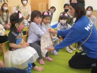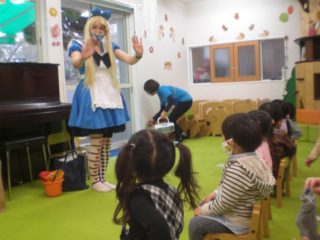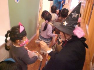 ハロウィンパーティーの当日は、英語の先生もアリスの仮装で来てくれました。「treak or treat」の練習をして、みんなかわいいねこさんに変身したら……いよいよハロウィンパーティーの時間です。おさんぽロープにつかまって園内を歩いて行くと、魔女になった先生や、かぼちゃのおばけになった園長先生が待っていてくれました。「treak or treat!」と言うと、お菓子がもらえ、大喜びのお友だちです。