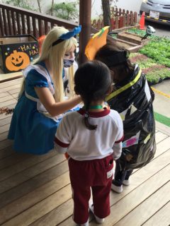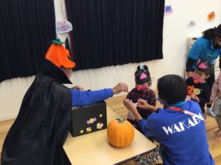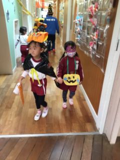 年中組、年長組のお友だちはペアになって園内を回りました。年長さんが地図を持ち、お菓子をもらえる場所を年中さんに優しく案内してあげる姿が見られました。「トリックオアトリート!」「センキュー!」と元気よく言って、お菓子をもらって帰ってきた子どもたちは、とても満足そうで楽しいハロウィンとなりました。