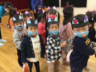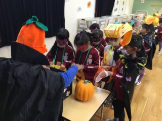 2歳児のおひさまくらぶのお友だちは、ねこのカチューシャとマスク、年少組はかぼちゃのお面をつけて参加しました。少し恥ずかしそうな姿も見られましたが、先生やお友だちと「トリックオアトリート!」と言い、お菓子をもらうことができてうれしそうでした。