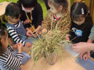 まず、この秋に収穫された『稲』を実際に見て、手でつまみ、すり鉢に入れてもみすりをしました。