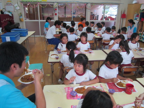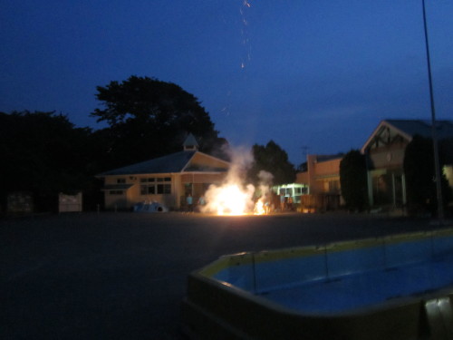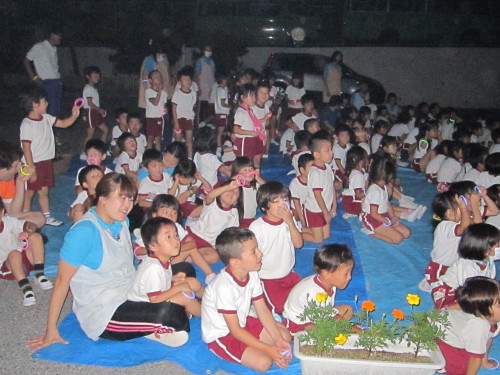 夜はみんなでカレーライスを食べたり、花火を見たりしました。お家の人が恋しくなっていた子どもたちも、花火を見て元気になっていました。