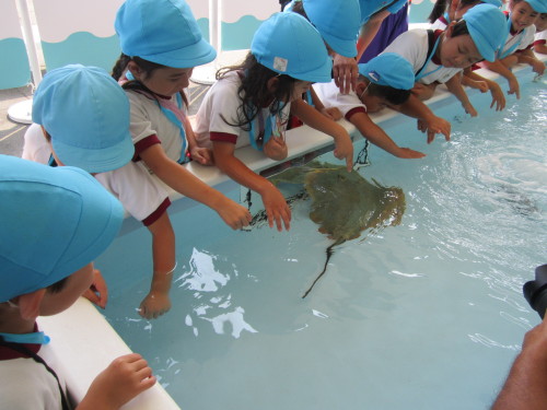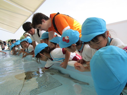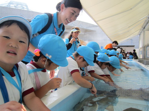 魚とふれあえるコーナーでは、エイやサメの背中に直接触ることができました。恐る恐る水の中に手を入れ、『サメの背中はざらざらしてる!』『エイはつるっとしてた!』などいろいろな発見をすることができました。