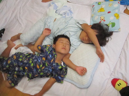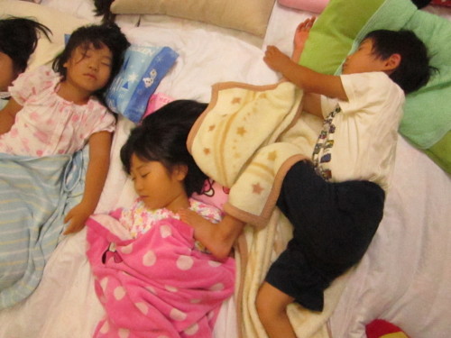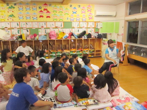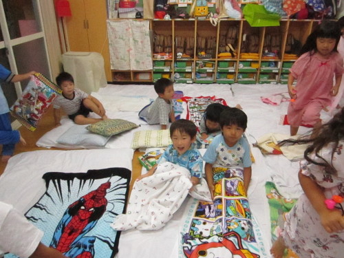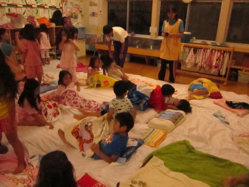 みんなでパジャマに着替え、寝る前には絵本の読み聞かせも行いました。たくさん遊んで疲れ切った子どもたちは、あっという間に夢の中・・・。仲良しのお友だちと寄り添い眠る姿は、とても微笑ましく感じました。
