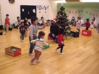 続いては、プレゼント運びゲームです。サンタさんのようにソリを引いてプレゼントを運び、ツリーの下に飾ります。ツリーの周りを元気いっぱいに走るお友だちやプレゼントを落とさないように慎重に運ぶお友だちなど、思い思いの運び方で体を動かしました。