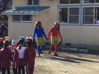 そしていよいよ、怖い顔をした鬼たちが園庭にやってきて豆まきが始まりました。追いかけてきたり、驚かせてきたり、中には鬼に抱きかかえられる子もいましたが、負けじと「おにはーそと!」「ふくはーうち!」と豆まきをすることができました。