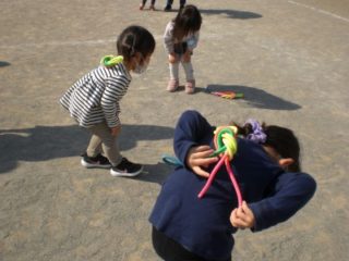 次に、縄跳びを頭に乗せてお侍さん、背中に乗せておじいさん・おばあさんに変身しました。ゆっくりと慎重に歩き、上手にバランスをとることができました。