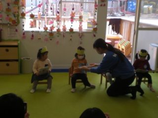 最後はお部屋で2月のお誕生日会も行いました。上手にイスに座り、お返事することができました。