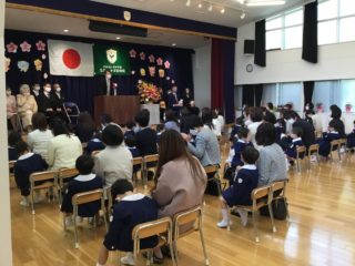 式では、クラスのお名前を呼ばれ元気いっぱいにお返事をしたり、理事長先生や園長先生のお話を上手に聞いたりすることができました。