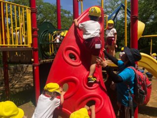 公園に着くと、幼稚園にはない遊具を見つけて、お友だちと一緒に滑り台を滑ったり、
