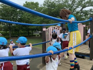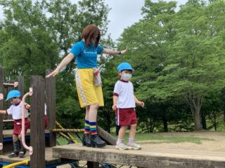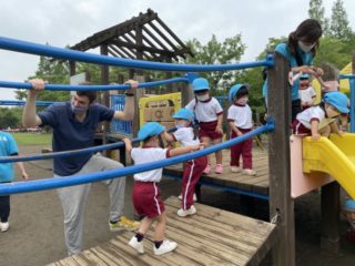 公園に着き、安全に遊ぶためのお約束を話をしました。荷物を置くと、遊具へめがけうれしそうに走って行くお友だち。幼稚園にはない遊具にわくわくし、少し高い所にもチャレンジして登ったり、体を思いっきり動かして遊んでいました。