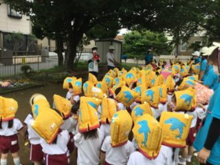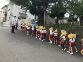 おひさまくらぶのお友だちには事前に避難訓練を行うことや避難方法を伝えてから行いました。防災頭巾を被り、先生と一緒に園庭まで避難することができました。