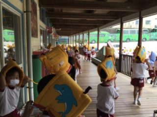 今回は事前に避難訓練をすることは知らせずに行いました。突然の火災警報に驚くような姿も見られましたが、放送を聞いて自ら防災頭巾を被り、落ち着いて避難することができました。