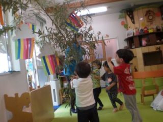 とても大きな笹の登場にみんな喜んで、お家の人とうれしそうに飾っていました。