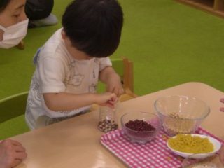 この素材をペットボトルに入れてマラカス作りを行うことを伝えると、早くやりたい!とそわそわした様子の子どもたち。