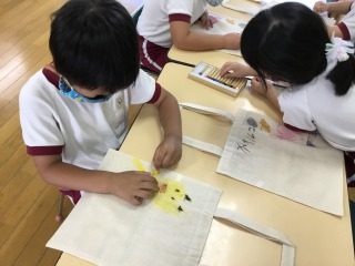 オリジナルカバン作りでは、プラ板を焼くところをじっと覗いていたり、「何を描こうかな」と悩んだりしながら好きな絵を描いていました。とても素敵なカバンを作ることができました。