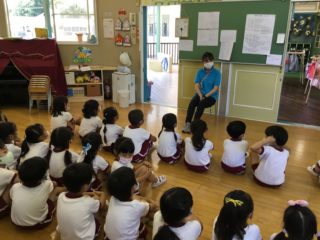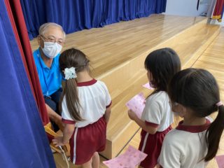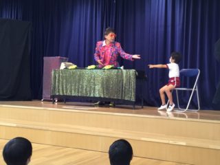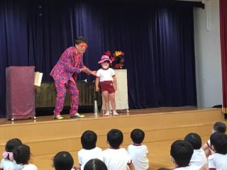 また、前に出てアンディ先生のお手伝いもしたお友だちもいました。他の子どもたちも「やりたい!!」と言いながら手を挙げていました。最後マジックはみんなでマジックのかけ声をすると箱の中からハトやお花がたくさんでできて大興奮でした。