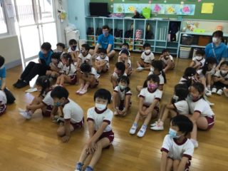 始めのつどいでは、一日の予定や園長先生の話を聞き、ワクワクが止まらない様子でした。