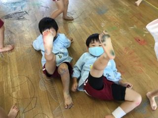 何もない部屋に「こんなに広かったんだ!」「なんか寂しい」と言う声が聞こえてきました。子どもたちは壁に自分の顔や虹を描いたり、床には海の生き物たちを描いて広い海にしたりしました。手や足を絵の具だらけにして思いっきり落書きをすることができました。今までありがとう!