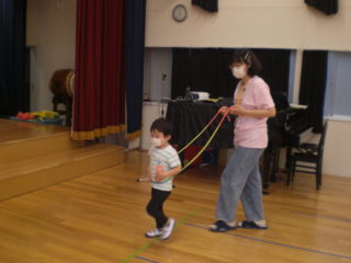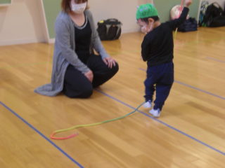 なわをヘビさんのように動かしてお散歩したり、床の上に置いて綱渡りのように歩いてみたりしました。