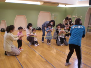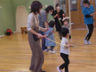 体と心がほぐれてきたところで、いよいよ体操の先生と「なわあそび」の時間です。