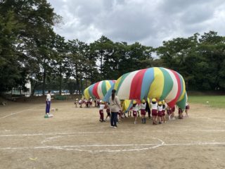 年中組さんは、パラバルーンやお遊戯をクラスの友だちと力を合わせて練習に励んでいます。一つひとつの技の完成度も少しずつ高まっています。