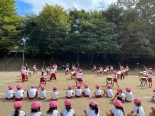 年長組さんは幼稚園生活最後の運動会です。暑さに負けず和太鼓や組体操、クラス対抗リレーに真剣に取り組んでいます。