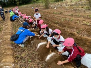 15日(金)にうめ組・ふじ組、25日(月)にもも組・さくら組でお芋堀り遠足に行きました。運動会が終わり、この日をずっと楽しみにしていた子どもたち。バスの中では「大きなお芋をたくさん掘るぞー!」と、張り切っていました。