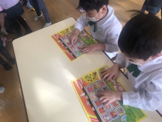 シールやカード、おはじきやルーレットなどを使って、遊びの中で思考力や想像力を育んでいます。