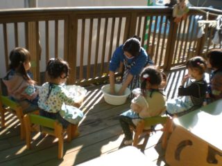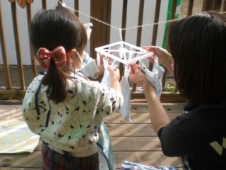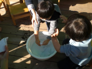 汚れた雑巾は、自分で水の中ですすぎ、両手でぎゅっと絞ることにも挑戦しました。