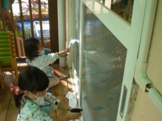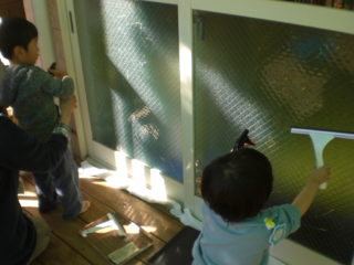窓拭き(ガラス戸を洗う)にも挑戦しました。