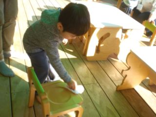 テラスに出て、(あらかじめ汚れが目立つようにしておいた)机、椅子をみんなで見つけました。