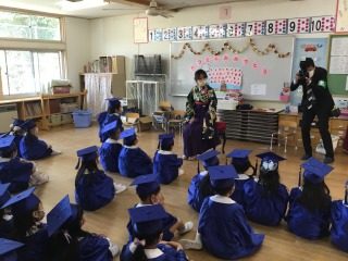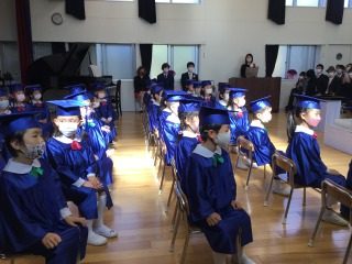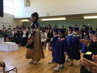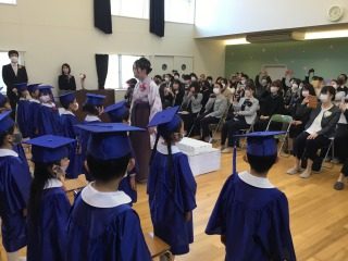 新型コロナウイルス感染症予防の為、1クラスずつでの式となりましたが、呼名されると元気よく返事をし、園長先生から一人ずつ卒園証書を受け取りました。子どもたちは終始真剣な表情を浮かべ、「ありがとうございました」とお礼の言葉をきちんと返したり、「卒園の歌」を堂々と歌ったりと、成長した姿をたくさん見せてくれました。