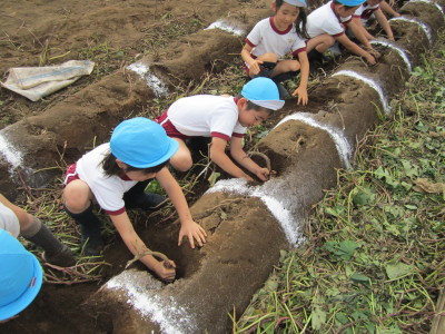 子どもたちは、「お芋掘りにいけるー!!」と期待を膨らませ登園してきました。