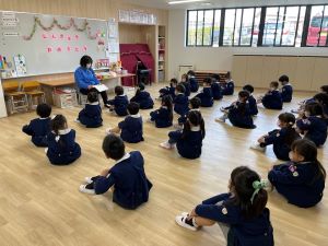 新型コロナウイルス感染症予防のため、始業式を年中組はお遊戯室で、年長組は各保育室で放送を聞き参加しました。