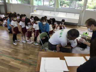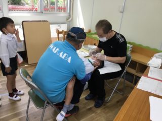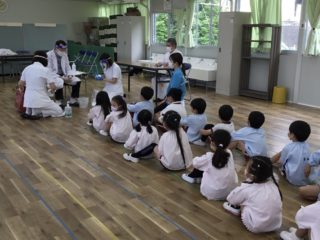 年少組さんは、初めてのことで緊張をした様子が見られましたが、最後までしっかりと検診を受けることができました。