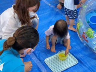 大きいプールに入って遊んだり、小さな桶でじっくり遊んだり