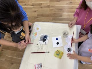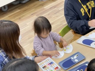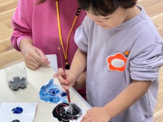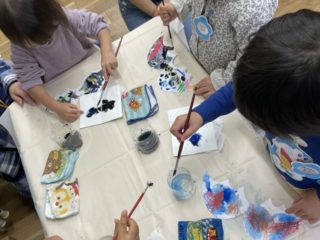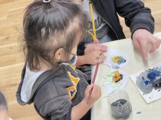 筆の使いかたや水のつけ方、先生の見本の手順をよく見てまねして、自分の力で取り組むことができていました。みんなで楽しく絵の具を塗ることができましたね!!