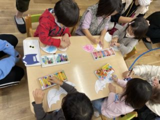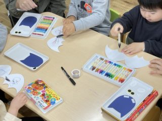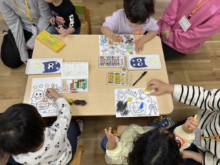 絵の具が終わったお友だちは、お家の人と一緒にこうもりの顔を作ったり、ハロウィンの塗り絵も楽しみました。