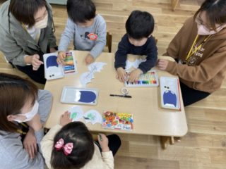 初めての絵の具に夢中になってどんどん塗り進めるお友だちや、クレヨンが絵の具をはじく様子を楽しみながら、少しづつ色付けしているお友だち、白いところがなくなるまで何度も色を足しながら根気強く取り組むお友だち、いろんな姿を見せてくれました。