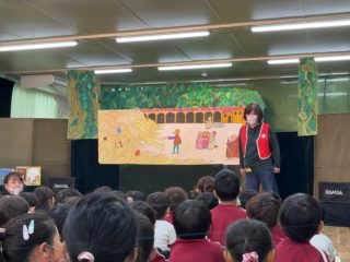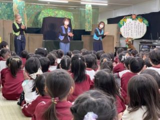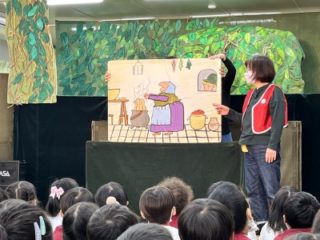 年長組は“まほうつかいのノナばあさん”というお話の大型紙芝居と“鬼のカーランコ”の人形劇を見ました。こやぎの家に来たカーランコを怖がっている子もいましたが、困った時の合言葉をみんなで「ぶんちーばんちーぽんちー!」と言い、ハチがカーランコをやっつけてくれました。最後は「食べられなくてよかった!」と安心した表情をしていました。