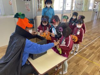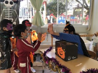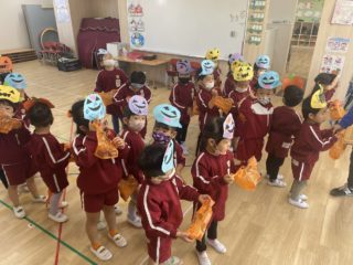 2歳児のおひさまくらぶのお友だちはこうもりのお面、年少組はおばけやかぼちゃのお面をつけて参加しました。先生やお友だちと一緒に「トリックオアトリート!!」と言い、お菓子をもらうことができてとてもうれしそうでした。