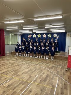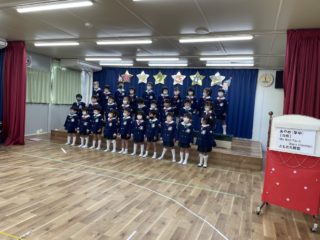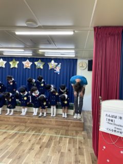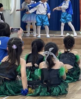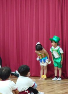楽しみにしていた衣装に身を包み、にこにこして発表する、2歳児おひさまさん。年少さん。年中さん。