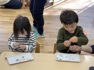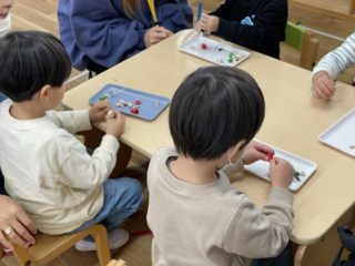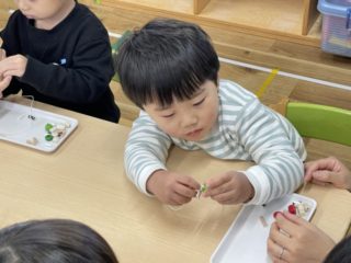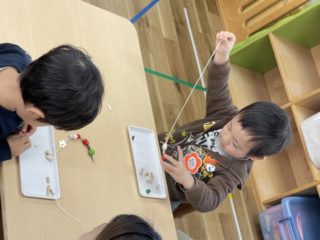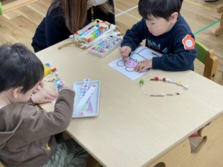 一つひとつじっくり通していく子、色や形をみてどんな順番でひもに通していくか考えながら進める子