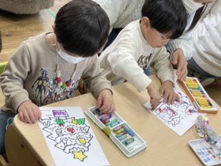 ひも通しが終わった子から、クリスマスのイラストのぬりえや、輪飾り作りを行いました。