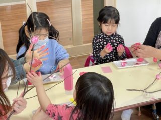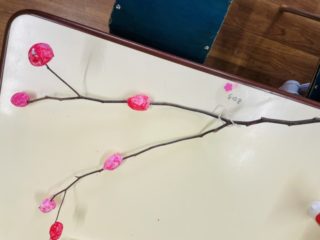 暖かい春の予感を感じさせる、ピンクや赤の色鮮やかなももの花を、紙粘土と絵の具を使って作りました。