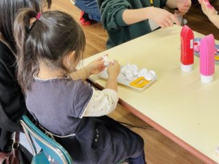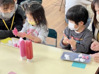 真剣な表情で粘土を分けたり、絵の具を混ぜてこねたり、一生懸命に取り組む姿を見せてくれました。