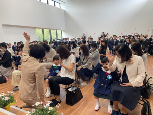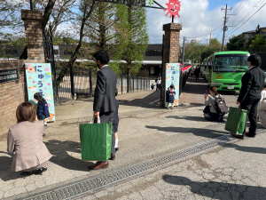 新入園児のお友だちは、真新しい制服に身を包み、ピカピカな園舎でこれから始まる幼稚園生活に期待を持ちながらお家の人と一緒に笑顔で登園してくれました。