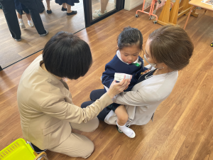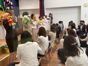 緊張した表情のお友だちもいましたが、先生たちと手遊びをしているうちに少しずつ笑顔が見られるようになり、楽しむ姿見がられました。