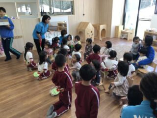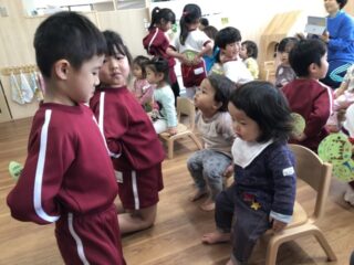 今日は年長さんが未満児のお友だち、年少さん、年中さんの兄弟クラスの部屋に行き歓迎会を行いました。何組さんが来てくれるのか、どのようなことをするのかとても楽しみにしていました。